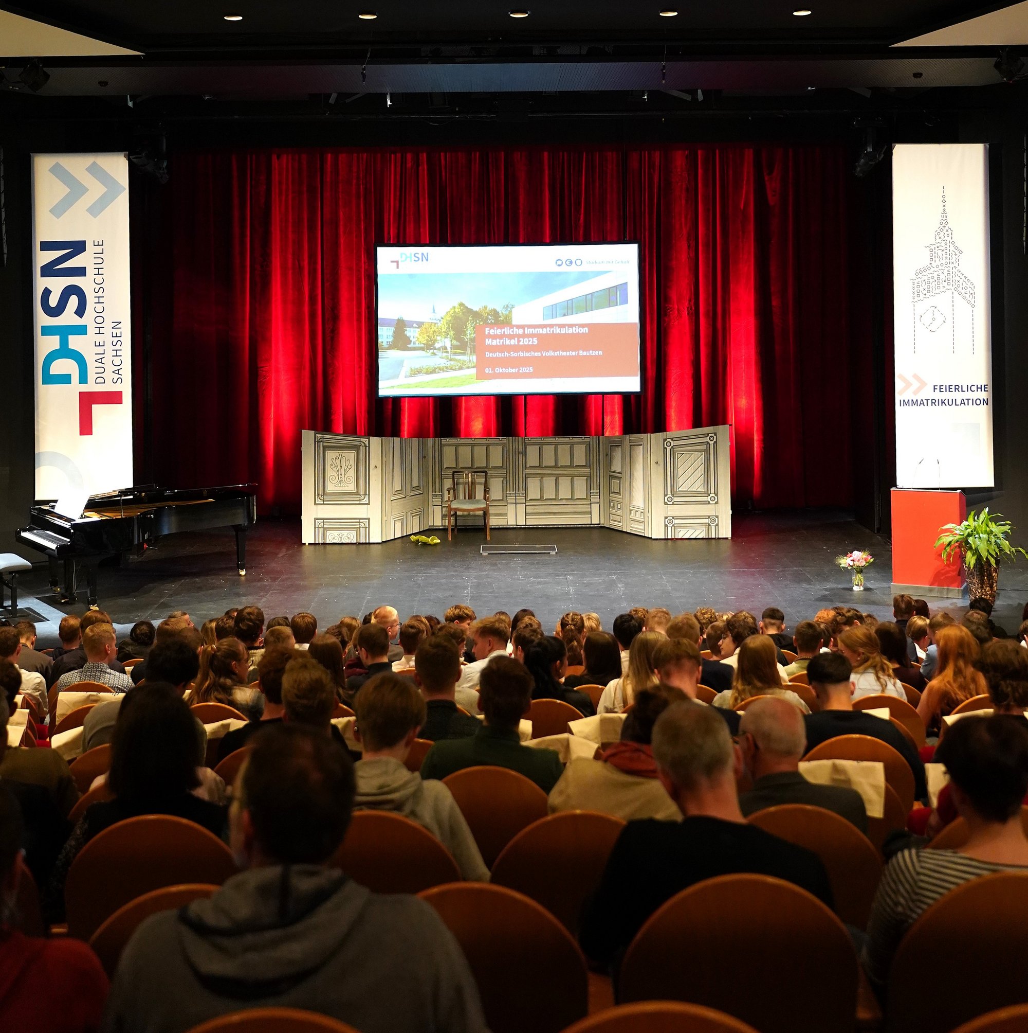 Prof. Dr. Katharina Bühn, Direktorin DHSN Campus Bautzen: »Die feierliche Immatrikulation ist für uns jedes Jahr ein besonderer Moment, der die enge Verbindung von Kultur, Bildung und regionaler Identität sichtbar macht. Die erwartungsvollen Blicke unserer neuen Studierenden, die festlich geschmückte Bühne und die Atmosphäre des Theaters verleihen diesem Tag eine ganz besondere Bedeutung. Wir freuen uns darauf, gemeinsam den Start in diesen wichtigen Lebensabschnitt zu feiern.«