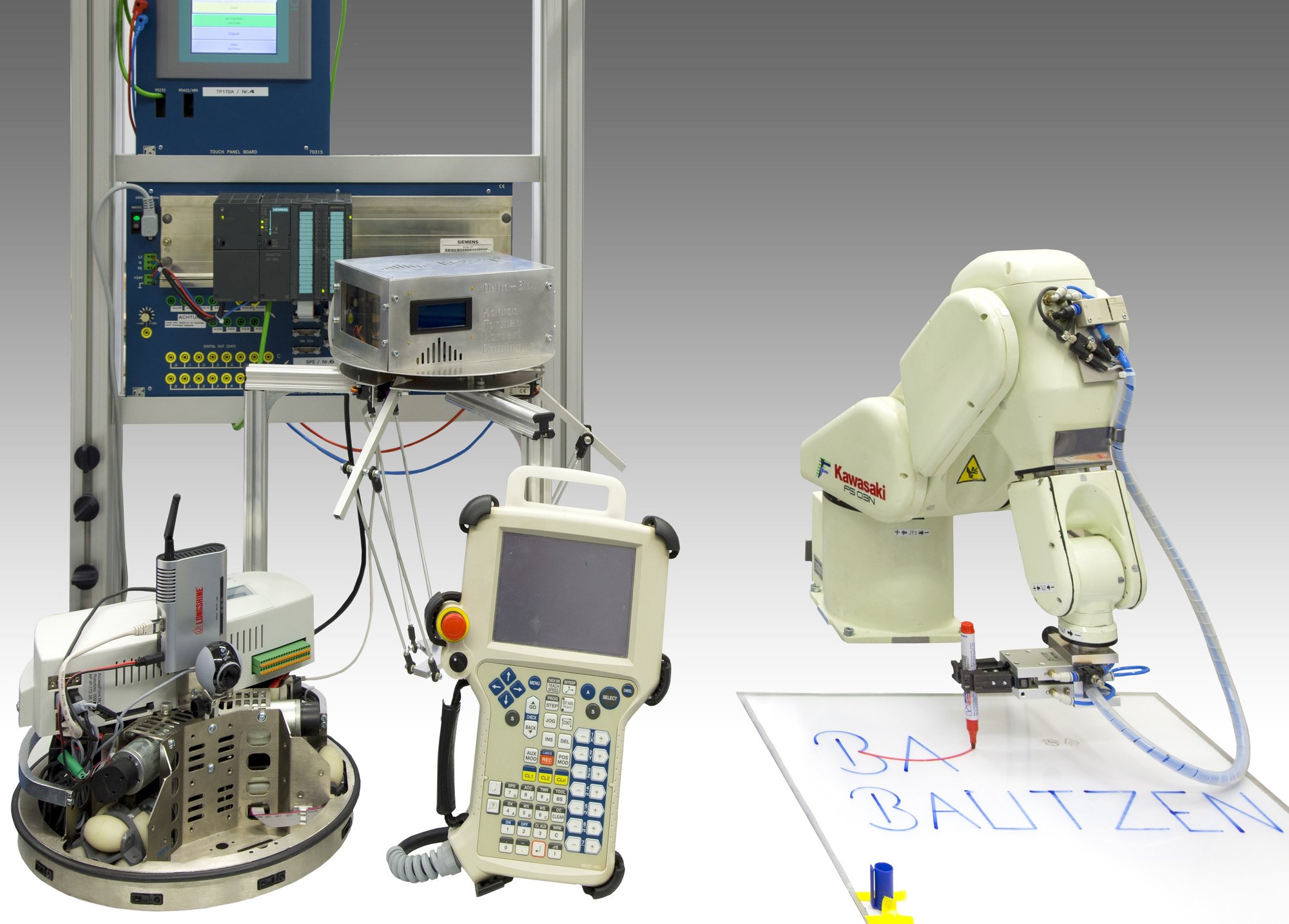 Im Roboterlabor findet der praktische Teil der Ausbildung Automatisierungssysteme und Prozessrechentechnik statt. Ziel der Laborpraktika ist, die Studenten mit modernen Automatisierungsgeräten vertraut zu machen und auf das spätere Berufsleben praxisnah vorzubereiten. Ein Ansatz hierzu ist beispielsweise die Bedienung und Online-Programmierung eines seriellen Kawasaki-Industrieroboters in Kombination mit einer übergeordneten SPS-Steuerung, welches dem Prinzip vieler durch Roboter automatisierter Produktionszellen entspricht.