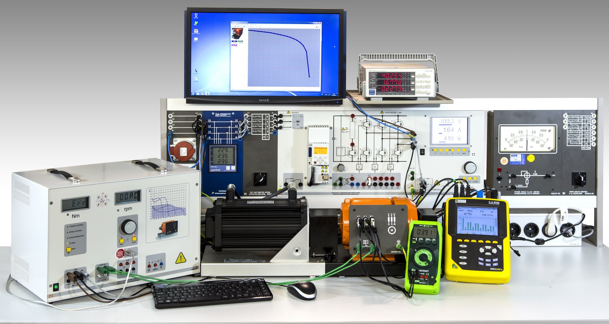 Hierzu dienen Laborplätze die für die Untersuchung von Gleichstrom-, Wechselstrom-, Drehstrommotoren, sowie Synchronmaschinen ausgestattet sind. Die Studenten ermitteln Leerlauf- und Belastungskennlinien und spezifische Motorparameter.