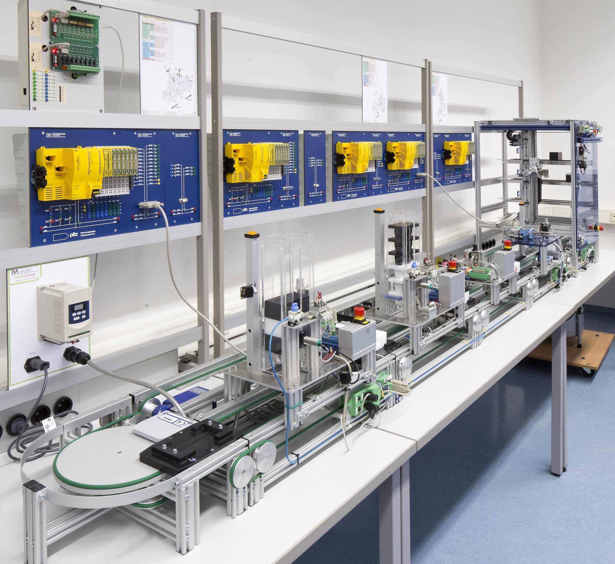 Mit dem Versuchsplatz „Fertigungsautomatisierung“ lernen die Studenten nicht nur nicht nur die Ablaufprogrammierung der Prozesse mit Standard SPS Komponenten, sondern auch die Einbeziehung der Aspekte der Sicherheitstechnik mit Sicherheitsschnittstellen kennen.