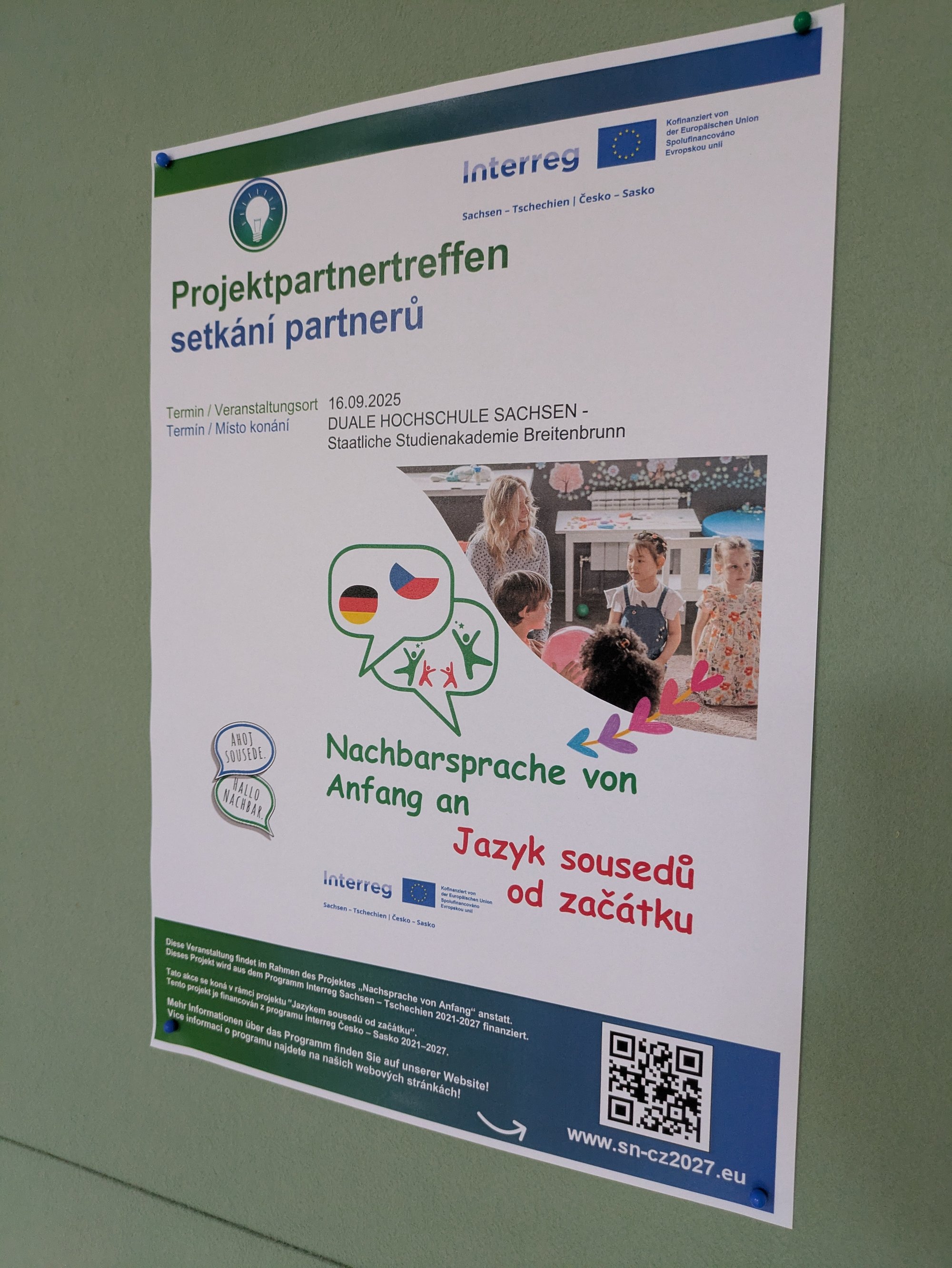 Am 16.09. trafen sich alle Projektpartner zu einem erneuten Austausch im Projekt an der Dualen Hochschule in Breitenbrunn. Die hybride Veranstaltung fand von 10-16 Uhr im Martin-Buber-Saal statt und stand unter dem Thema Austausch zur Wirkung des alltagsintegrierten Sprachbades in den Einrichtungen und das Feedback der pädagogischen Fachkräfte sowie Eltern und Familien zu den Projektaktivitäten. Neben den sprachlichen Angeboten wird den interessierten Einrichtungen ein großes Netzwerk sowie Weiterbildungsmöglichkeiten im Rahmen der Mehrsprachigkeit angeboten. Ebenso werden persönliche Begegnungen zwischen deutschen und tschechischen Kitakindern ermöglicht. Das Projekt öffnet so allen Teilnehmenden ein Fenster zur Kultur, Traditionen und den Denkweisen der Nachbarn. Einen weiteren Schwerpunkt bildete die Fokussierung auf das kommende sowie letzte Projektjahr 2026! In diesem letzten Jahr heißt es nun u.a. die Erkenntnisse zu bündeln und Handlungsempfehlungen für Politik und Verwaltung zu formulieren, um die nachbarsprachige Bildung auch nach diesem tollen Projekt in der Region weiter „erleben“ zu können.