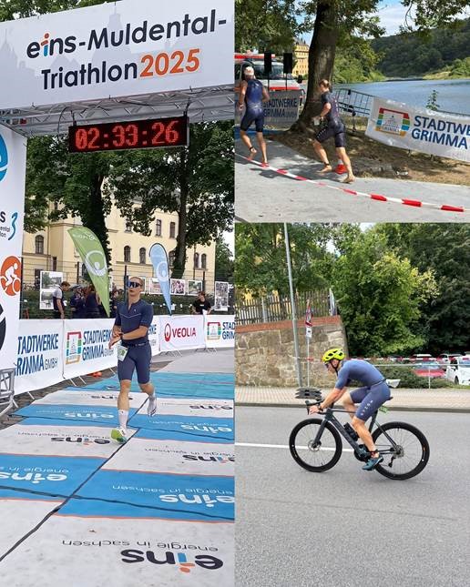 "Am Samstag ging es für mich beim 20. Muldental Triathlon in Grimma an den Start. Das Event bei dem ich im Jahr zuvor meinen ersten Triathlon absolvierte und was nach einem Sturz beim Radfahren, mit nicht so guten Erinnerungen bei mir im Gedächtnis geblieben ist. Doch dieses Jahr sollte sich das ändern. Ich hatte mich für die Olympische Distanz angemeldet, bestehend aus 1,5 Kilometer Schwimmen, 40 Kilometer Radfahren und 10 Kilometer Laufen. Das Schwimmen in der Mulde begann mit einem Wasserstart und führte die ersten 350 m gegen die Strömung. Ich kam dabei gut weg und fand schnell in meinen Rhythmus. Nach der Wendeboje ging es mit der Strömung zurück Richtung Start, bevor es auf die zweite Runde ging. Das Schwimmen lief gut und nach 31 Minuten war ich aus dem Wasser und im Wechselgarten auf dem Weg Richtung Fahrrad. Die Radstrecke war ein Rundkurs durch die Stadt welche 6-mal gefahren werden musste. Es war eine technisch anspruchsvolle Strecke welche durch einige Anstiege und enge Kurven ständig Konzentration und viel Kraft forderte. Am Streckenrand feuerten viele Zuschauer die Fahrer kräftig an, was besonders bei den Anstiegen für extra Portion Motivation sorgte. Die Strecke von 40 Kilometern mit 350 Höhenmetern absolviert ich in 1 Stunde und 7 Minuten. Danach ging es wieder hinein in den Wechselgarten, schnell in die Laufschuhe geschlüpft und ab auf die Laufstrecke. Die 5 Kilometer lange Laufstrecke entlang der Mulde war 2-mal zu laufen. Meine geplante Pacing Strategie konnte ich dabei gut umsetzten und beendete das Laufen in 48 Minuten. Mit einer Gesamtzeit von 2:33 Stunden kam ich dann ins Ziel, diesmal sturzfrei und mit vielen tollen Erinnerungen an ein spaßiges und gut organisiertes Event im Gepäck.
