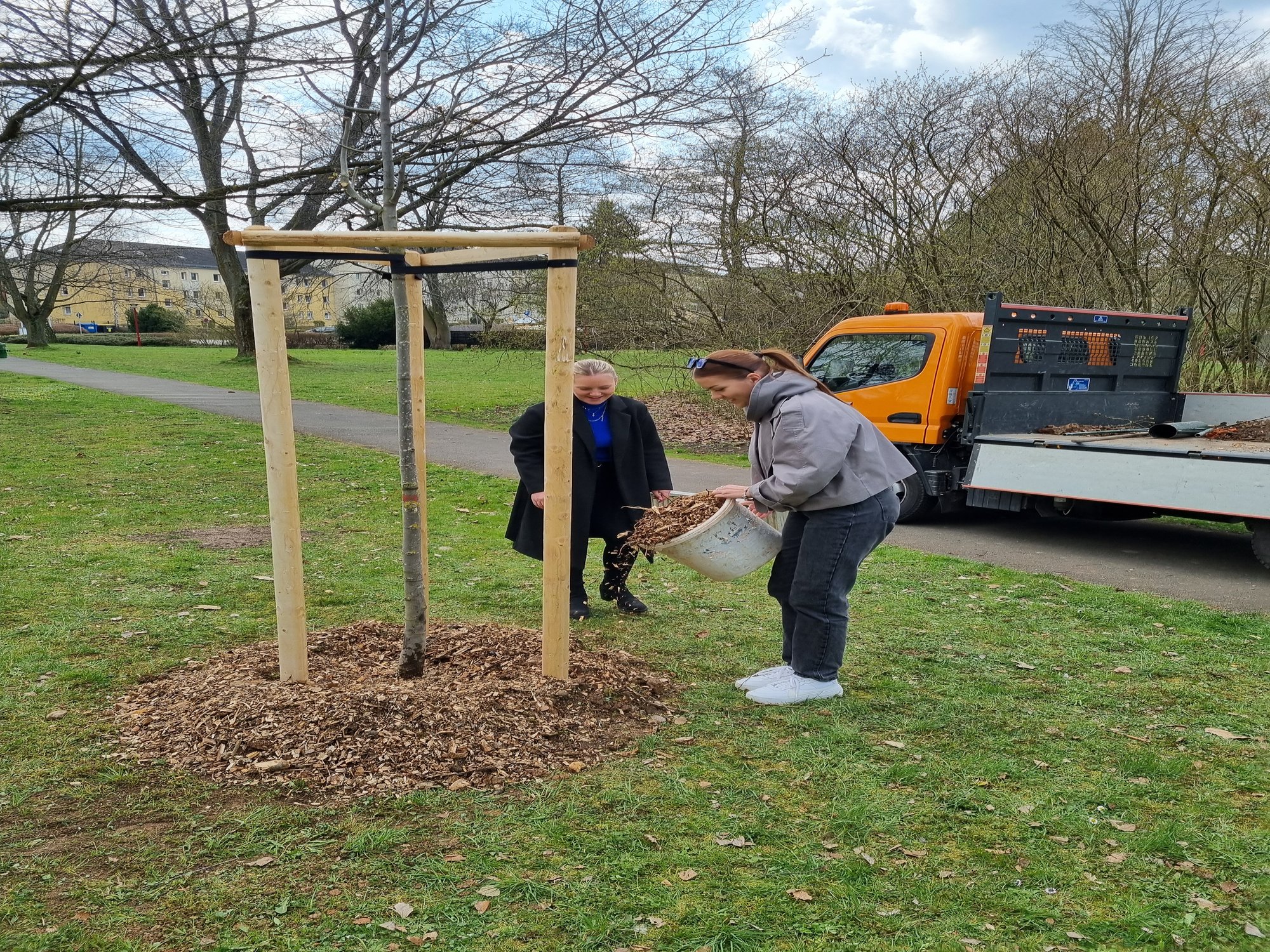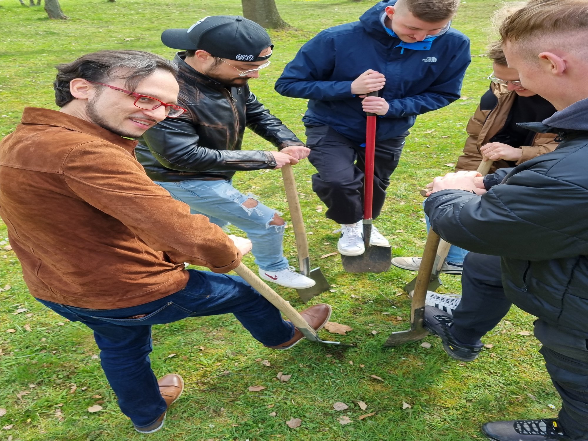 Am Mittwoch den 09.04. war es dann soweit. Der Bauhof der Stand Glauchau liefert den Baum am Carolapark an und unsere Studies können loslegen. Teamarbeit und Muskelkraft sind gefragt die 2,50m hohen Baum für Glauchau in den Boden zu bringen.