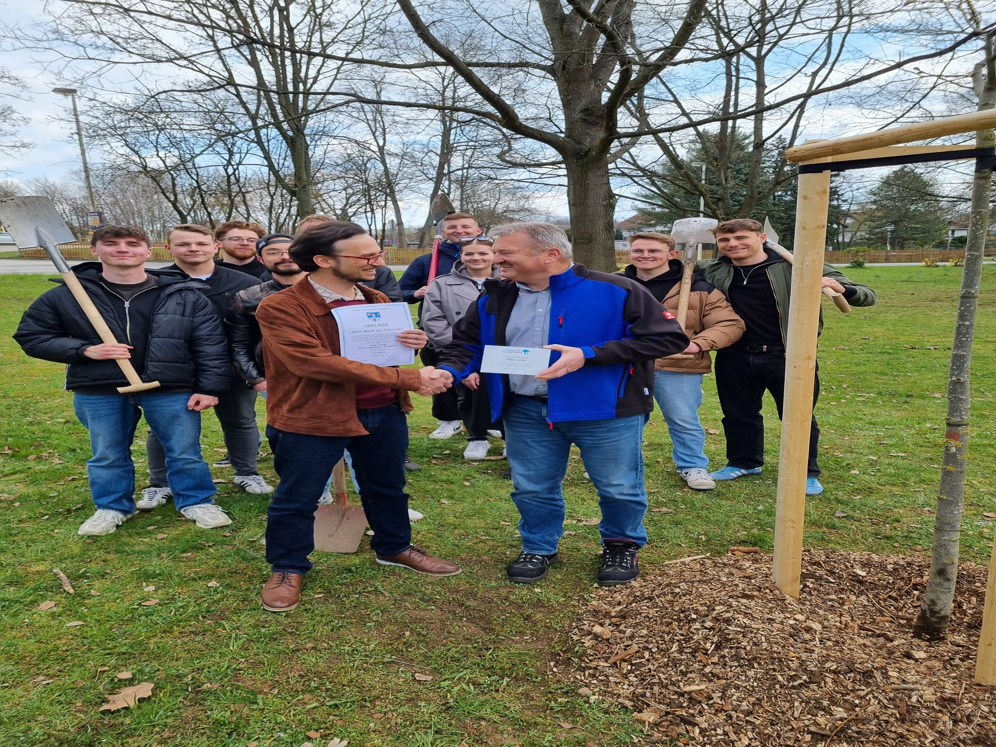 Als das gute Stück in der Erde war, überreichte Herr Steffen Naumann, Fachbereichsleiter des Fachbereichs V Kommunale Immobilien Glauchau und seine Kollegin Frau Henriette Lindner vom Grünflächenamt die Urkunde an unsere Studenten, auf der sowohl der Standort als auch die Art des Baumes vermerkt sind. Natürlich bekommt der Baum eine Tafel, auf der verzeichnet wird, wer den Baum gespendet hat.