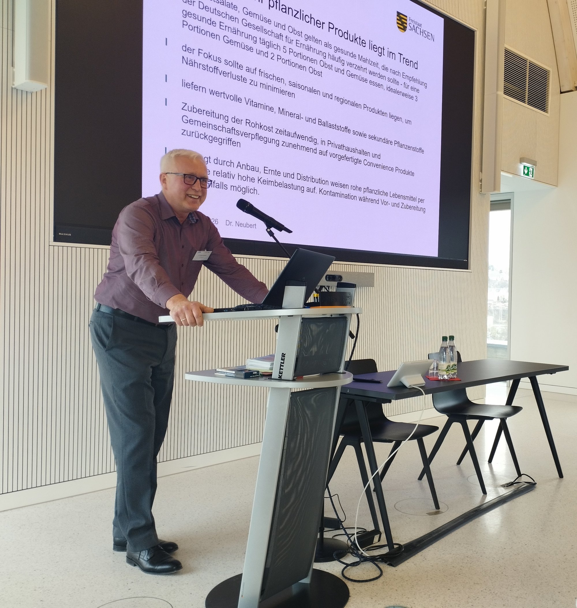 Den Abschluss bildete der Vortrag von Eckhard Neubert von der Landesuntersuchungsanstalt für das Gesundheits- und Veterinärwesen Sachsen, der aktuelle Erkenntnisse zu mikrobiellen Risiken beim Verzehr pflanzlicher Lebensmittel – insbesondere bei nicht thermisch behandelten Produkten wie Salaten und Kräutern – sowie entsprechende Untersuchungsergebnisse vorstellte.
